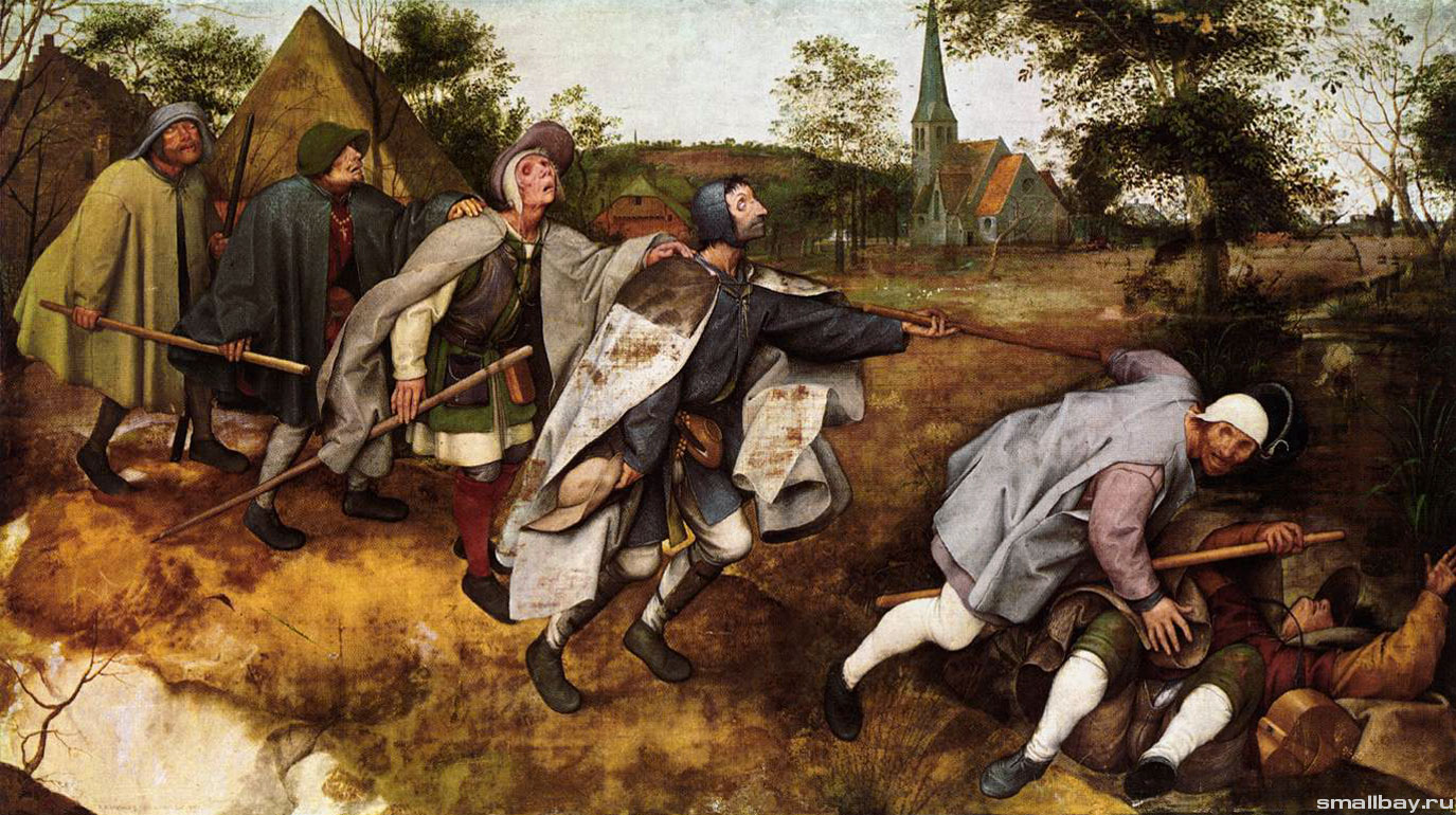 О чем эта картина? О страхе стареющего художника потерять зрение? Возможно. А может быть о вере. Вере, как способности видеть во тьме, вопреки этой самой тьме. Мы все на ощупь пробираемся вперед во тьме земной жизни - убогие, жалкие, сомневающиеся. Мы скользим на глине и вот вот упадем в пропасть, в канаву, сядем в лужу. Кому как повезет. Верим ли мы что на дне этой самой канавы наши глаза все так же будут видеть свет?