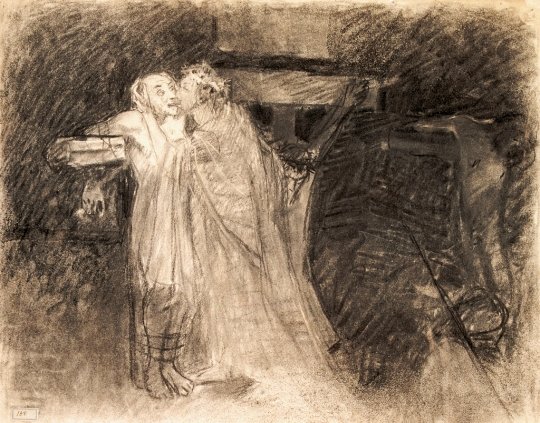 Работа на холсте продолжается. Меняются ракурсы фигур, форма крестов, время с дня меняется на ночь и обратно. То распятия высоко, почти в небе, а вот фигуры уже сняты с крестов, лежат на земле, у подножия крестов. Скорее всего, незаконченная "Голгофа" - тоже вариант все того же долгого поиска. Ге неутомимо и мучительно ищет композицию.