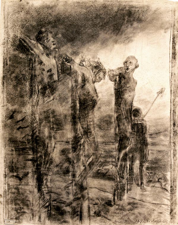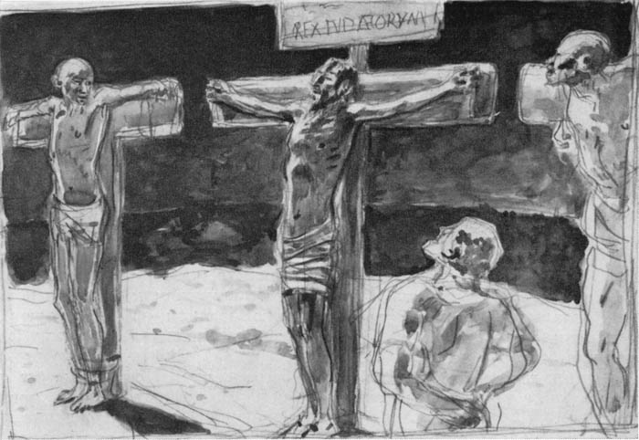 Художник не удовлетворен. Он переносит кресты на задний план, повторяя в чем-то композицию картины Иванова. Затем отказывается и от этого, понимая, что смысл распятия ускользает от него.