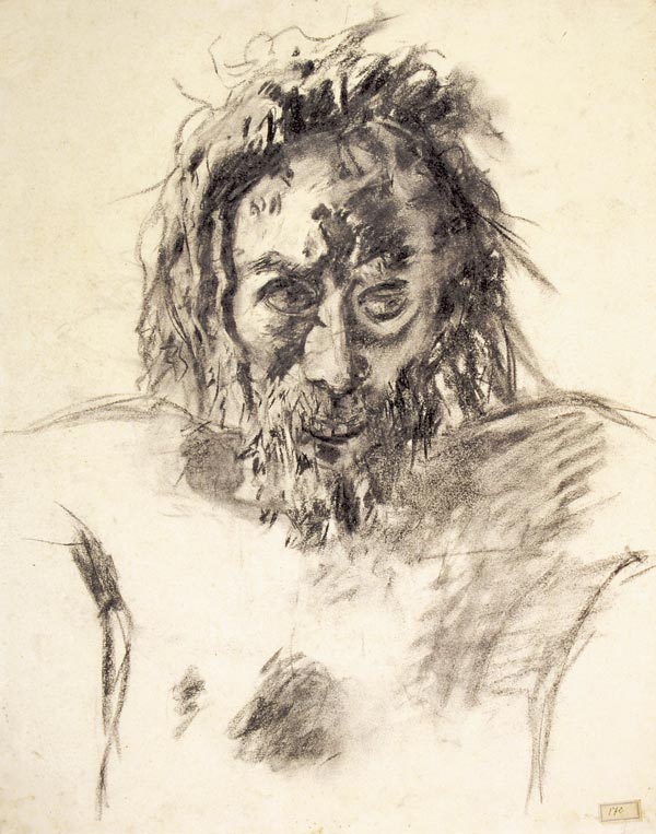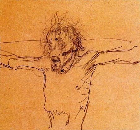 Не Христос, разбойник прочно притягивает взгляд. Уродливая фигура с разбухшим животом, вывернутыми плечами с оттопыренными ушами на бритом черепе, с вытаращенными глазами и ртом, разверзнутым в зверином крике.