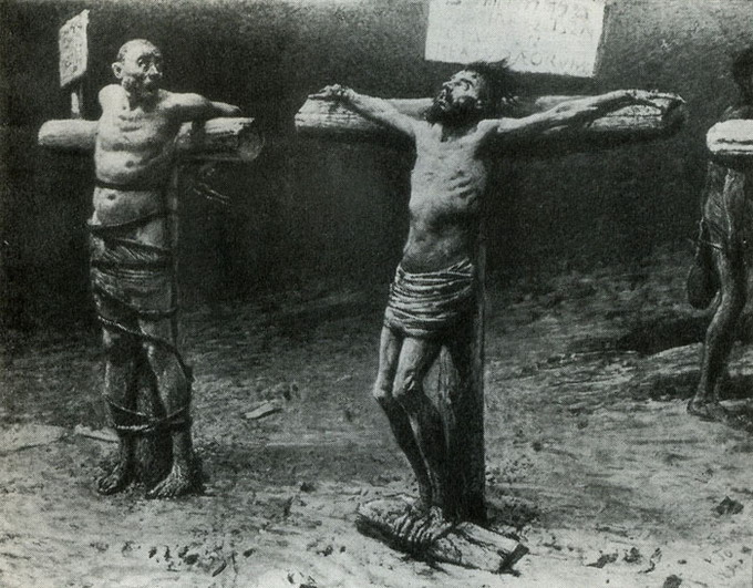 Однажды Ге почти закончил картину. На фоне темного неба т-образные кресты. Изломанный силуэт изможденного страданиями Христа. Остро согнутые, сведенные судорогой колени, застывшее лицо, искаженное мучительным криком. Рядом - выпрямившийся невероятным усилием разбойник с состраданием смотрим на него.