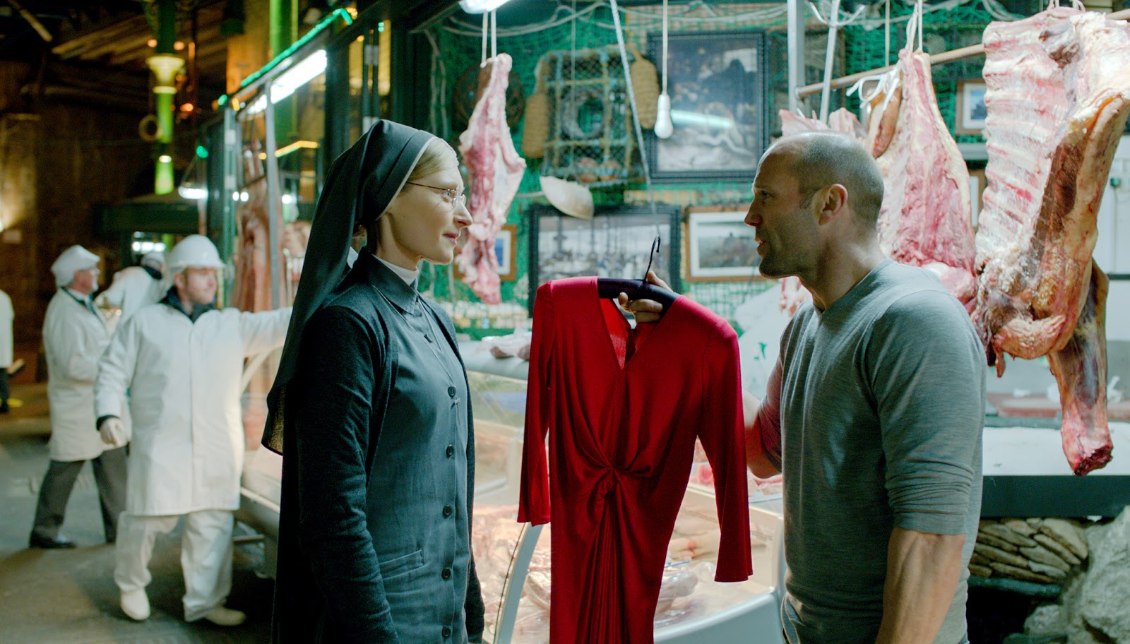 Начальные кадры, в которых герой предстает в образе плешивого бомжа алкоголика еще не смущают, и даже могут показаться смелыми, ведь зритель уверен, вот сейчас, в следующем кадре Стейтем обретет положенный вид: лысеющий брутальный герой с трехдневной щетиной на лице в отлично скроенном костюме, ладно сидящем на широких плечах, с большим пистолетом на поясе и в любой готовыми крукопашному бою.
