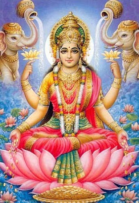 Лакшми переводится как "Удача", другое ее имя "Шри" (Процветание). Лакшми является одной из самых любимых богинь многих индуистов. Она связана с изобилием, богатством, процветанием, плодородием, красотой, любовью, удачей. Часто ее изображают в тот момент, когда она поднимается из первозданного океана. Она прекрасна, как десять миллионов встающих солнц, и является воплощением чувственности. Лотосоглазая и украшенная лотосами, она - Вечная Повелительница всех существ. Она сидит на коленях Вишну и является покровительницей процветания.