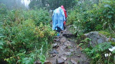 Дождь шел почти не прекращаясь. Казалось, что на небе подвесили марлю и пропустили через неё небесную воду. Временами дождь усиливался... Но удивительно - лица участников были светлы, голоса веселы, походка бодра... В предгорье сейчас установлен кардон, там мы оплатили туристический взнос.