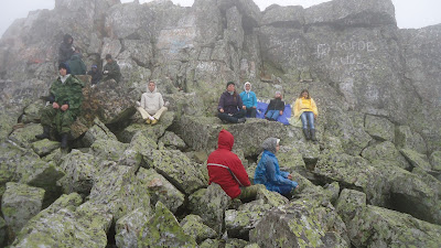 Часть участников осталась внизу. Наш предусмотрительный проводник Василий взял с собой тент, который натянули и укрылись от ветра. Ребята пели мантры, делали пранаямы и ели чернику. А большая часть участников отправилась на вершину.