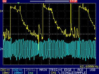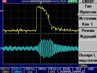 | Одиночный пробой в пушке, крутое дугогашение и восстановление выходного напряжения – верхний луч, 1кл – 10кВ, нижний луч – переходный процесс в инверторе, 1кл – 20А. |