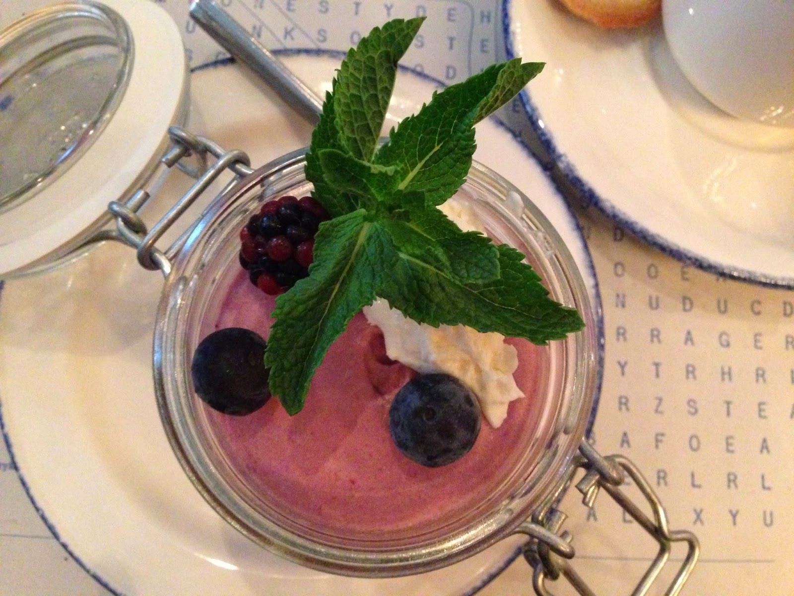 Время десерта, время десерта! Вроде и хватит уже набивать брюхо, но коль пятница, и душа моя требовала разврата, а настроение повышения уровня эндорфинов, то бишь гормона «счастья, радости и обжорства», путем всеобщего референдума с мозгом, желудком и талией мы пришли к заключению, что десерту быть! Выбор пал на Ежевичный мусс с мармеладным соусом из маракуйи и свежими ягодами. Между прочим, сам ELLE поставил рекомендацию этой сладости в банке. А этот журнал дурного не посоветует. Итак, кофе, ложка, салфетка на шее — я готова, несите десерт!