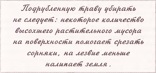 Самые невыгодные условия — это когда приходится срезать сорняки в перерывах между дождями, по мокрой земле, все время останавливаясь и очищая лезвие от грязи. Если изо дня в день моросит дождь, го почти все, что вы срезаете, укореняется. Впрочем, даже такая очистка идет на пользу посадкам, она сильно тормозит развитие сорняков. Вот только дается это тяжеловато.