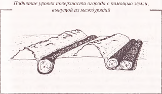 Как видно из рисунка, земля из междурядья идет на поднятие поверхности, а на ее месте оказывается бревно или песок. Вам может показаться, что огород поднялся совсем незначительно, но это не так. Нескольких сантиметров (5 — 7) вполне достаточно, чтобы предохранить большинство овощных растений от избыточного увлажнения.