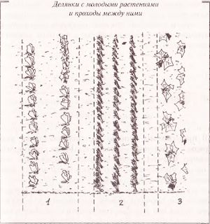 На рисунке показаны ряды молодых овощей и проходы между ними. В дальнейшем я буду называть наши посадки делянками или грядками, подразумевая, что это не высокие грядки в традиционном смысле, а просто