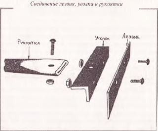 Я выбрал железную рукоятку, а не деревянную, так как мне всегда нравилось делать у дачных инструментов — у молотка, у топора — рукоятки из обрезков водопроводных труб: тогда они становятся вечными. Тяпка с ручкой-трубкой тоже получилась очень прочная: я до сих пор пользуюсь той своей самой первой широкой тяпкой. Должно быть, подойдет и деревянная рукоятка, из черенка для лопаты. Не исключено, что тяпкой с деревянной ручкой будет легче работать. Осталось соединить рукоятку и лезвие с помощью стального уголка и винтов, как показано на рисунке.
