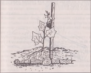 Теперь пример того, как вы можете воспользоваться знаниями об утеплении почвы. Вы посадили дикий виноград, чтобы он создал заграждение. Впервые годы он растет медленно. Чтобы плети росли быстрее и поскорее увили решетку или веранду, вам следует по садку произвести, как показано на рисунке.