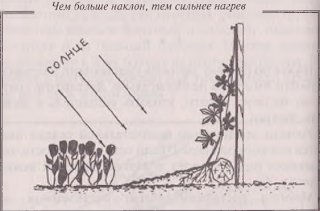 Видно, что с солнечной стороны оставлен кусок чистой земли, и он имеет небольшой наклон. Солнечные лучи падают на такую поверхность почти отвесно и сильнее всего нагревают ее (почти как на экваторе, где солнце стоит в зените). Такой виноград будет расти быстро.