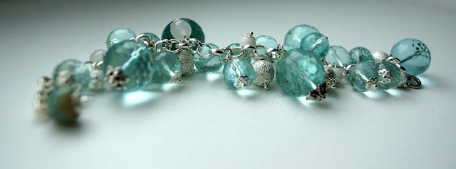 Волшебный, прозрачный, голубой браслет. Использовала крупные бусины из кварца, металлические бусины, металлическую фурнитуру. Мне очень нравится такой цвет.