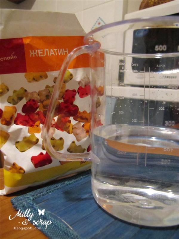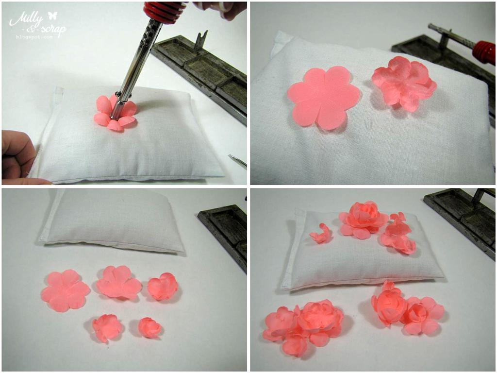 http://milly-and-scrap.blogspot.ru/...og-post_10.html Автор Milly.  Итак, для начала нужно правильно подготовить ткань. Использовать можно любую - от атласа до кожи и меха (их, правда, не нужно желатинить :) ). Готовим раствор - 3-4 ч.л. желатина нужно залить стаканом холодной воды и оставить набухать на час. Потом поставить этот раствор на маленький огонь и разогреть, постоянно помешивая, но не кипятить. Раствор должен быть горячим, но не обжигать руки. Опускаем ткань в раствор, чтобы она хорошо пропиталась. Отжимать не нужно, пропускайте ткань между пальцев, чтобы убрать лишний желатин. И сразу же ткань нужно очень хорошо расправить и повесить сушиться, не нужно складывать ее вдвое, лучше всего повесить на булавочки и не в коем случае не давать слипаться ей с соседними тканями, потому что если они склеятся и высохнут, то так и останутся - это почти как клей.[more] Перед работой ткань лучше всего погладить Под сушилкой обязательно застелите пол газетой или чем-нибудь еще - желатин будет капать и убрать его с линолиума, например, достаточно трудно!  Когда ткань высохнет (а это занимает где-то час), то будет похожа на бумагу. На фото видно, что она стоит и держит форму. Для удобства хранения я просто скручиваю ее в рулон.  Пока ткань сохнет, можно сделать стебли для будущих цветочков, еще их называют "летонами". Берем тонкую медную проволоку и креп-бумагу. Проволоку нужно расправить, а бумагу порезать на длинные полоски - не разворачивая рулон бумаги, просто отрежьте от него часть. Креп-бумага мягкая и тянется. Зажимаем пальцами правой руки верхний конец проволоки вместе с полоской бумаги, левой рукой придерживаем и распределяем полоску по проволоке. Начинаем вращать верхний конец и тем самым окрутим бумагой стебель. Совет - не отпускать и все время держать верхний конец, тк если вы будете опускать пальцы по мере оплетки бумаги, то сверху она может начать распускаться. Это легче понять на опыте, чем объяснить : Вот, что должно получиться: Теперь с помощью клея ПВА нужно закрепить бумагу. Я просто капаю на пальцы клей и пропускаю между ними летон. Если мазать густо, то после высыхания стебель будет белёсым, поэтому тут важно не переборщить. И еще моя зеленая креп-бумага очень красит пальцы :) к концу работы кажется, что мне на руки пролили зелёнку. Но все легко смывается хозяйственным мылом + немного потереть пальцы пемзой.  Ткань высохла и можно начинать делать цветочки. Кстати, нажелатиненную ткань можно гладить - только без пара и воды, а то пятна останутся. А вот и мой набор инструментов: паяльник со сменным жалом, три больших и три маленьких бульки, три колечка и два ножа - одно и двужильные. Еще для работы нужна песочная подушка и резиновый коврик. Подушку я сшила сама из нескольких слоев белой х/б ткани и набила песком для шиншил :) просто он чистый и без всяких жучков и тп. Если вы берете песок на улице, то его хорошо нужно прокалить на огне. Я выбрала для цветов розовый креп-сатин. Складываем ткань в несколько раз и вырезаем цветок из 6 лепестков. Для одной розы нужно 2 больших и 3 маленьких цветочка.  Надрезаем лепестки к центру и начинаем булить каждый лепесток от края к центру, он начнет загибаться. Хорошенько пробулим середенку, чтобы все лепестки поднялись вверх. Каждая булька в паяльнике разогревается в среднем 2-3 минуты, потом я отключаю паяльник от сети и приступаю к работе - теп