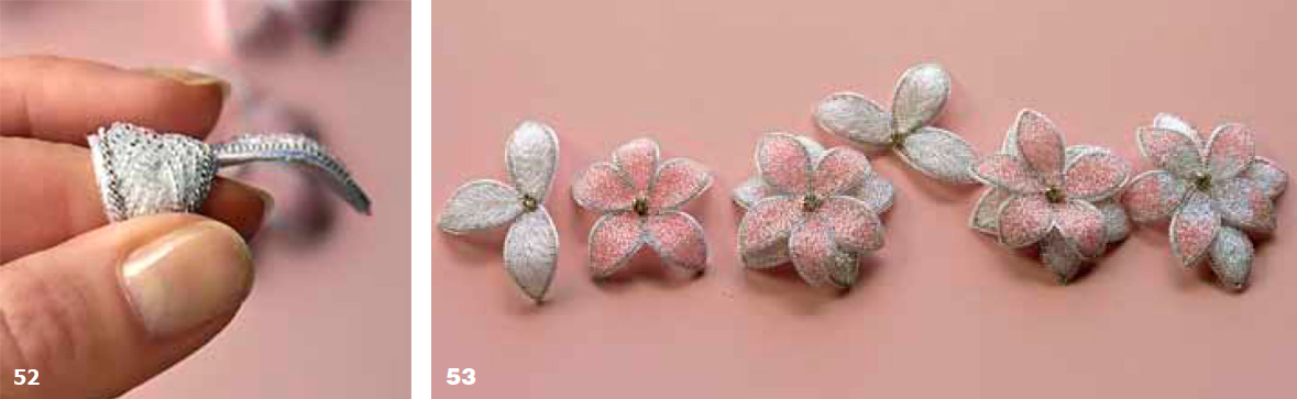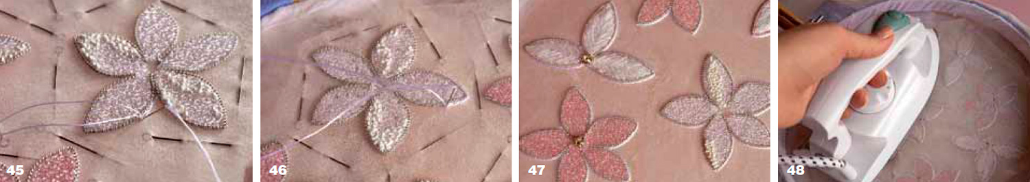 9. Проклеиваем металлик-органзу флизофиксом, накладываем клейкой стороной на изнанку, обкалываем булавками вокруг каждого цветка (илл. 41) и трилистника (илл. 42) и обшиваем белой шелковой нитью табмурным швом каждый цветок и трилистник (илл. 43—46) дважды (схема а—6). Пришиваем камни/бижу на розовые цветы и на все трилистники, снимаем булавки (илл. 47) и еще раз делаем тепловую обработку маленьким утюгом (илл. 48).