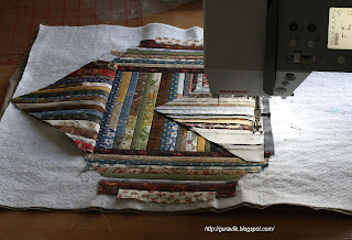 2. Наносим разметку на наполнитель (в моем случае хлопковый) рисунок блока можно взять, первую полоску я приклеила с помощью двусторонней клеевой паутинки (которая видимо меня замотает, сокращенно ДКП)
