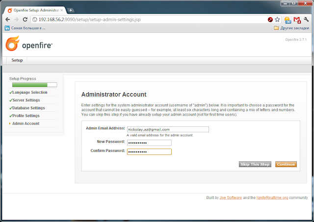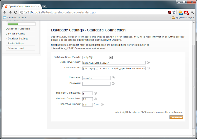 Вместо 127.0.0.1:3306 необходимо указать IP и порт mysql сервера. Если Mysql у Вас находится на одном хосте с OpenFire(как у меня) и используется стандартный порт, то изменения вносить не нужно. Далее за / необходимо указать имя базы данных, созданной для OpenFire. В моем случае это db_openfire. За знаком ? идут параметры подключения, указывающие на необходимость использования Unicode. Если опустить данные параметры, OpenFire будет некорректно работать со значениями на, к примеру, русском языке. Жмем Continue