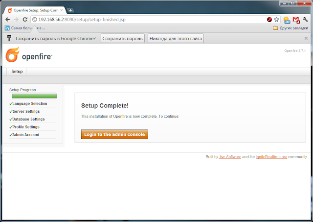 OpenFire запуститься автоматически. Web-интерфейс для администрирования доступна по http на 9090 порту хоста, например так: