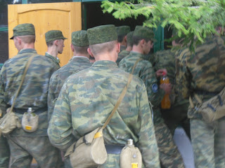 А справа наш ужин. Картошка,фасоль, хлеб,масло и чай. Как говорится, найди 10 отличий. Действительно, разница не большая. Да и что можно еще дать курсанту, если на него официально положено 300 рублей в сутки? Вот и приходиться вертеться начальникам, чтобы хоть как то достойно накормить своих подчиненных. Благо, кормят без перебоев. Но с другой стороны, если взять студента, то ситуация еще плачевней. "Бичи, бомжи ... (гадость типа доширака)" и пельмени. Ништяк. Мы еще хорошо живем! Но все равно половина населения казарм с удовольствием изменило бы свой рацион именно на студенческий. Я бы отказался (ИМХО).