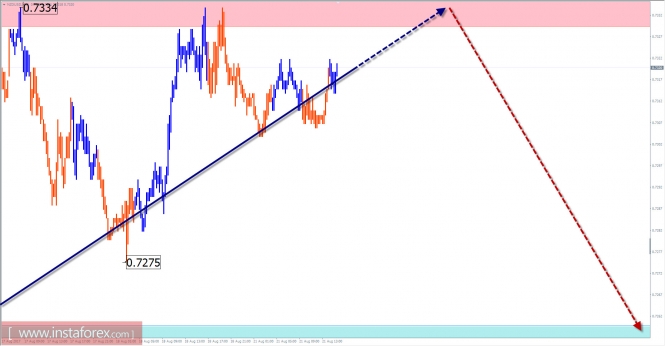 Последней, незавершенной на сегодня, конструкцией является восходящий отрезок от 11 мая. В нем с конца июля наметилось встречное снижение, формирующее среднюю часть волны (В). Форма волны неправильная, скрытого вида, с удлинением в сторону основной тенденции. Коррекция в такого вида волнах часто завершается на минимально возможных уровнях.