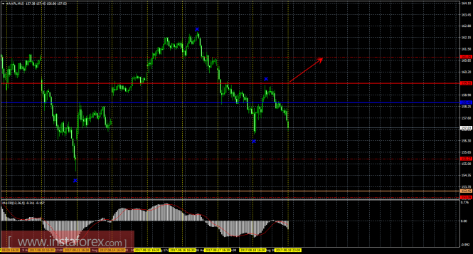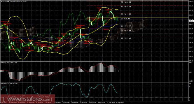 На 15-минутном графике рекомендуется рассматривать ордера на покупку с целью 161,05 при закреплении цены выше 159,55 (Тенкан-сен), ордером Stop Loss ниже 159,55 и при направленном вверх индикаторе MACD.