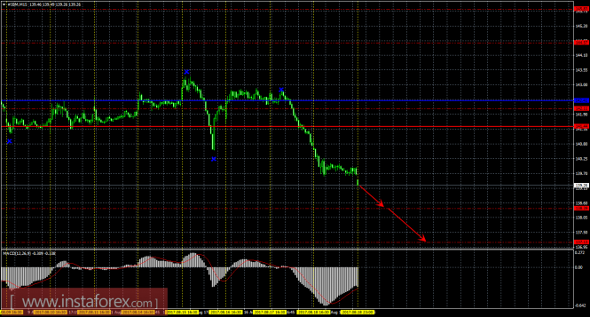 Анализируя график акций компании IBM, видно, что цена продолжает несильное, но уверенное движение вниз, о чем сигнализируют все индикаторы. Текущий «мертвый крест» – остается сильным (так как цена располагается ниже облака Ишимоку), поэтому ордера на продажу актуальны по этому признаку. На данный момент целью для нисходящего движения выступает первый уровень поддержки 138,39. Следующим таргетом для движения вниз является уровень 137,13. Медвежья модель «Харами» указала на возобновление движения вниз. Индикатор MACD направлен вниз, также сигнализируя о текущем нисходящем движении, разворот индикатора наверх укажет на новый виток коррекции. Стохастик зашел обратно в область перепроданности, что свидетельствует о нисходящем настроении на рынке. Боллинджер Бандс показывает нисходящий уклон – полосы не расширяются и направлены вниз. Отскок цены от первого таргета может спровоцировать виток коррекционного движения. На младшем графике видно, что цена продолжает движение вниз. Таким образом, сейчас являются актуальными короткие позиции с целями уровни поддержки 138,39 и 137,13. Индикатор MACD начал разряжаться. Последний верхний фрактал не обновлен, поэтому приоритетным является движение вниз.