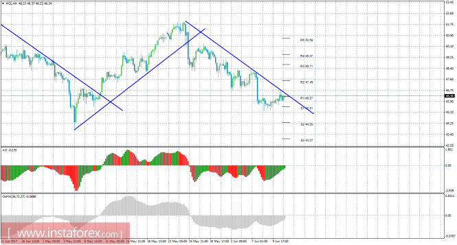 Уровни поддержки и сопротивления – красные горизонтальные линии.Материал предоставлен компанией InstaForex - www.instaforex.comТехнический анализ сырой нефти за 13 июня 2017 года