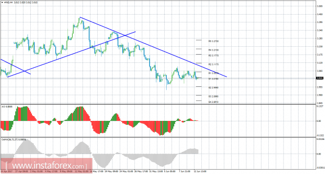 Красная линия и гистограмма с белыми барами в окне индикаторов.Материал предоставлен компанией InstaForex - www.instaforex.comТехнический анализ природного газа за 13 июня 2017 года