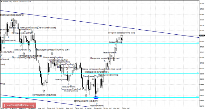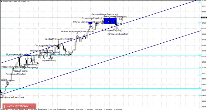 Котировки пары NZD/USD после образования бычьей формации «Поглощение» вроде бы вышли из зоны флэта, а рост котировок может быть продолжен 13 июня в направлении коррекционного уровня 200,0% - 0,7289. Образование медвежьей свечной формации позволит рассчитывать на разворот в пользу доллара США и возврат котировок к уровню Фибо 161,8% - 0,7199. Такая формация будет идентифицирована как коррекционная, исходя из направления равноудаленного канала. Закрепление курса пары под уровнем Фибо 161,8% повысит вероятность дальнейшего падения в направлении следующего уровня коррекции 100,0% - 0,7053.