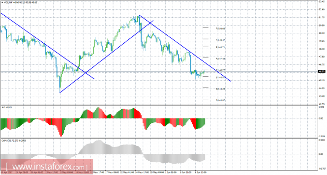 Анализ сырой нефти за 12 июня показывает, что цена в начале новой недели располагается между уровнями S1 и R1 и не определилась еще с направлением движения. Целями для движения вниз сейчас являются уровни поддержки S2 – 44,29 и S3 – 43,07, если цена закрепится ниже 45,51. Целью для витка восходящей коррекции выступает линия тренда. Нисходящая линия тренда поддерживает торгующих на понижение и делает актуальными ордера на продажу. Ее преодоление сделает актуальными ордера на покупку. Индикатор Awesome показывает текущее восходящее движение, так как последний закрытый бар зеленого цвета. OsMA также развернулся вверх, что говорит о восходящем характере движения и в более долгосрочном плане.