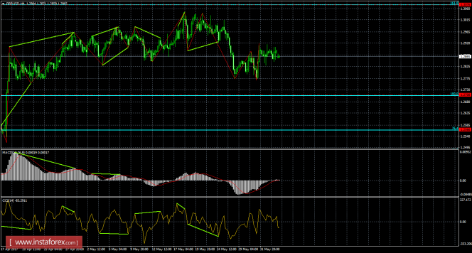 Без образования бычьей дивергенции или отбоя от какого-либо уровня коррекции, пара GBP/USD выполнила разворот в пользу английского фунта и начала рост в направлении уровня Фибо 161,8% - 1,3076. Назревающих дивергенций 5 июня по-прежнему не наблюдается ни у одного индикатора. Отбой курса пары от уровня коррекции 161,8% позволит трейдерам ожидать разворот в пользу американской валюты и некоторое падение в направлении коррекционного уровня 100,0% - 1,2708. Закрепление котировок под уровнем коррекции 100,0% повысит вероятность дальнейшего падения в направлении следующего уровня Фибо 76,4% - 1,2566.