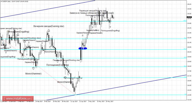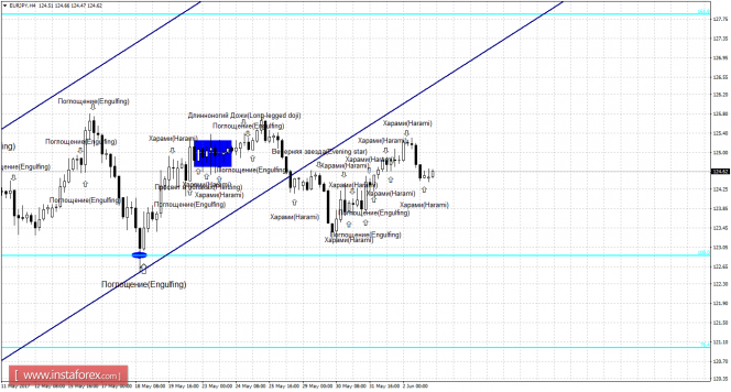 После образования новой медвежьей свечной формации «Харами» котировки выполнили разворот в пользу японской валюты и начали процесс падения в направлении уровня Фибо 100,0% - 122,87. Бычья формация «Харами» не смогла остановить падение котировок. Образование 5 июня новой бычьей формации вновь позволит трейдерам ожидать разворот в пользу валюты ЕС и некоторый рост пары в направлении уровня коррекции 161,8% - 127,85. Отбой курса пары от уровня Фибо 100,0% аналогично сработает в пользу начала роста котировок.