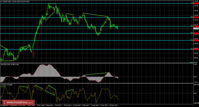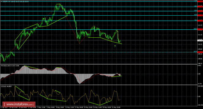 Отбой котировок от уровня коррекции 100,0% - 111,69 сработал в пользу японской валюты и возобновления падения в направлении коррекционного уровня 161,8% - 109,32. 5 июня назревает бычья дивергенция у индикатора MACD: последний лоу котировок уже ниже предыдущего, а аналогичный лоу индикатора может получиться выше предыдущего. Бычья дивергенция сработает в пользу доллара США и некоторого роста пары в направлении уровня Фибо 100,0%. Закрепление котировок над уровнем коррекции 100,0% повысит вероятность продолжения роста.