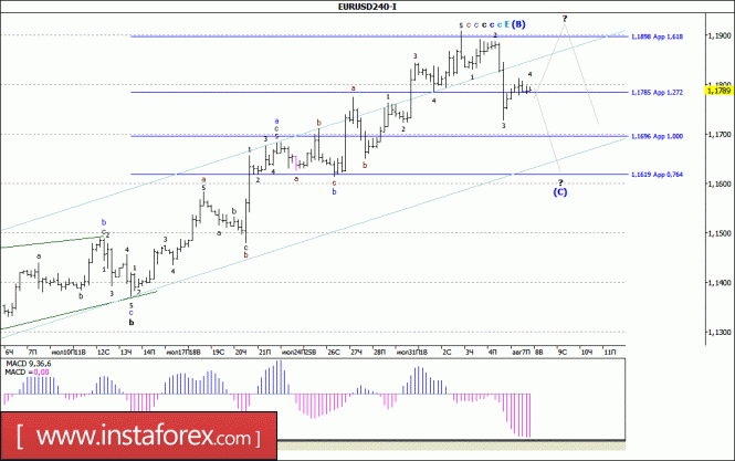 Валютная пара предположительно завершила построение волны (B) около отметки 1,1898. Сейчас возможно снижение котировок в рамках первых волн в составе будущей (С) с целями, расположенными около отметок 1,1696 и 1,1619, что соответствует 100,0% и 76,4% по Фибоначчи. Неудачная попытка преодоления отметки 1,1898 привела к отходу котировок от достигнутых максимумов. Волна Е, в (В) вполне может еще больше усложнить свою внутреннюю волную структуру.Материал предоставлен компанией InstaForex - www.instaforex.comEвро: Аналитики обещают 1.3000