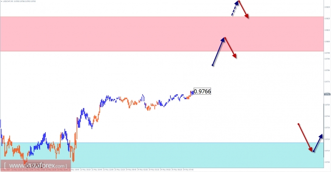 На графике основной пары швейцарского франка относительно американского доллара в последние недели можно наблюдать смену волновой структуры. Восходящая волновая плоскость, ведущая отсчет с 9 ноября, завершилась 3 недели назад на минимально возможном уровне удлинения. С 11 мая вниз стартовала новая волна, которая будет задавать трендовое направление ценового движения в ближайшие недели.