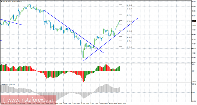 Уровни поддержки и сопротивления – красные горизонтальные линии.Материал предоставлен компанией InstaForex - www.instaforex.comТехнический анализ сырой нефти за 22 мая 2017 года