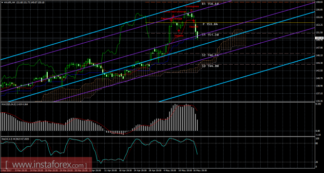 На младшем графике рекомендуется рассматривать ордера на продажу с целью 148,94 при открытии ниже 151,95 (Тенкан-сен), ордером Stop Loss выше 151,95. Разворот MACD вверх – виток коррекции.