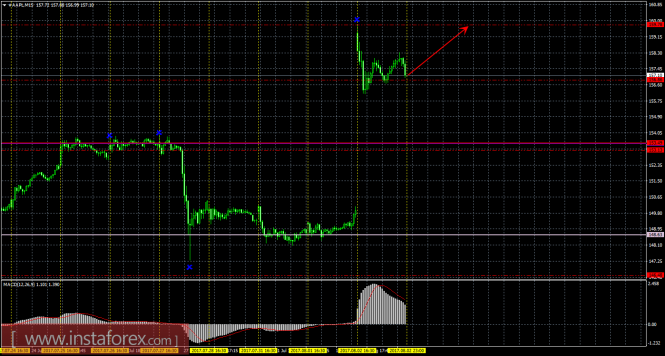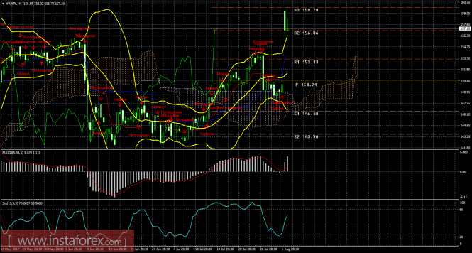 На 15-минутном графике рекомендуется рассматривать ордера на покупку с целью 159,78 при закреплении цены выше 156,86, ордером Stop Loss ниже 156,86 и при направленном вверх MACD.