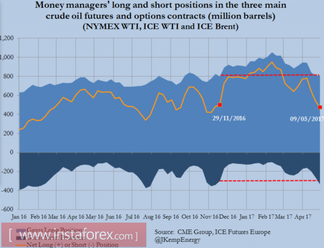 2017-05-16 14:50:44 (читать в оригинале)Котировки фьючерсов на нефть взлетели сразу на 3% после того, как стало известно, что Саудовская Аравия и Россия готовы продлить соглашение о сокращении добычи объемом 1,8 млн б/с до конца марта 2018. На рынке ходили слухи, что страны-участницы ноябрьского договора пролонгируют его до конца 2017, поэтому более отдаленные сроки вызвали новую волну покупок Brent и WTI. Ралли имеет неплохие шансы продолжиться, ведь между событиями полугодовой давности и текущей ситуацией немало общего. В частности, анализ спекулятивного позиционирования убеждает, что история с массовым закрытием хедж-фондами коротких позиций может спровоцировать стремительный рост цен на черное золото.