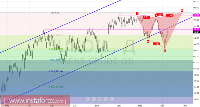 Технически прорыв сопротивления на $52,9 за баррель с последующим возвратом котировок в границы восходящего торгового канала станет сигналами о восстановлении «бычьего» тренда. При таком раскладе увеличатся риски активации и реализации перевернутого паттерна «Акула» с таргетом на 113%. Он соответствует отметке $58,5.