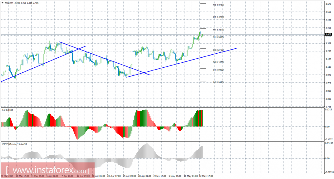 Анализ природного газа за 15 мая показывает, что цена в начале новой недели располагается между уровнями S1 и R1 и не определилась с направлением движения. На данный момент актуально восходящее движение с целями уровни сопротивления R2 – 3,5680 и R3 – 3,6790, если цена закрепится выше уровня 3,4570. Целями для витка нисходящей коррекции выступают уровни 3,2780 и 3,1670, если цена закрепится ниже 3,3890. Новая восходящая линия тренда делает актуальными ордера на покупку и поддерживает торгующих на повышение. Индикатор Awesome показывает локальное восходящее движение, последний закрытый бар окрашен в зеленый цвет. OsMA также направлен вверх, что сигнализирует о восходящем движении цены на газ и в более долгосрочном плане. Индикатор Awesome может начать разряжаться в ближайшее время.