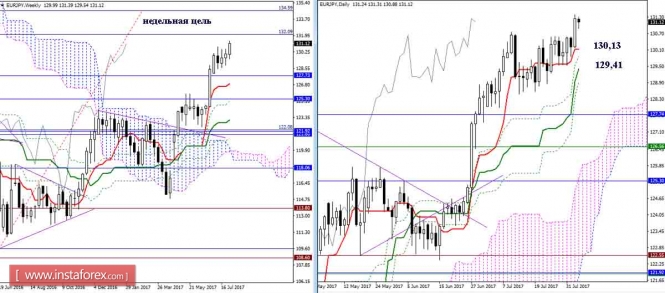 Валютная пара продолжает построение волны (B), которая принимает все более сложный вид. Сейчас возможно продолжение повышения котировок в рамках волны с, в с, в с, в Е, в (В) с целями, расположенными около отметки 1,1898, что соответствует 161,8% по Фибоначчи, и выше, около 20 фигуры. После завершения построения волны (B) ожидается протяженное снижение котировок в рамках волны (С). Повышательный коридор сохраняет перспективы повышения котировок. Дивергенция MACD_ака предупреждает о готовности инструмента к снижению. Неудачная попытка преодоления отметки 1,1898 может привести к отходу котировок от достигнутых максимумов.Материал предоставлен компанией InstaForex - www.instaforex.comДневной обзор GBP/JPY и EUR/JPY на 03.08.17. Индикатор Ишимоку