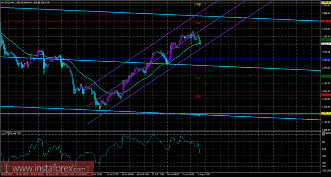 Хайкен Аши – индикатор, окрашивающий бары в голубой или фиолетовый цвета.Материал предоставлен компанией InstaForex - www.instaforex.comТехническая картина инструмента GOLD по системе «Каналы регрессии» за 3 августа 2017 года