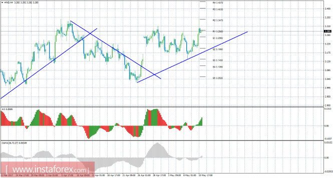 Красная линия и гистограмма с белыми барами в окне индикаторов.Материал предоставлен компанией InstaForex - www.instaforex.comТехнический анализ природного газа за 11 мая 2017 года