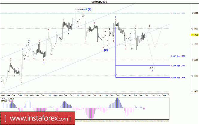 В ходе пятничных торгов пара EUR/USD не смогла продолжить развитие нисходящего движения, откатившись до конца дня выше отметки 1,1760. При этом можно предположить, что валютная пара все же оставалась в стадии формирования 3-й волны в (С), продолжая предпринимать попытки сформировать начало ее внутренней 3-й волны. Если это так, то валютная пара возобновит снижение котировок в направлении расчетных целей для этой 3-й волны в (С), расположенных вплоть до уровня 1,1500. В то же время, как уже отмечалось ранее, в сложившихся условиях сохраняется вероятность того, что 2-я волна в (С) может принять форму протяженной наклонной коррекции.