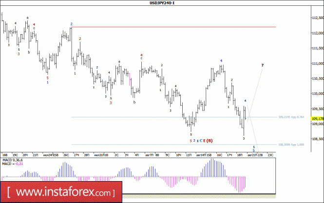 В целом ожидаемо, в ходе пятничных торгов пара USD/JPY продолжила развитие нисходящего движения и только после отработки отметки 108,60, отскочила на 100 б.п. от уже достигнутого минимума. При этом можно предположить, что валютная пара оставалась в стадии формирования принимающей вид полноценной пятиволновой структуры, 5-й волны, в 1-й, в C, в E, в (В). Если это так, то в процессе завершения этой 5-й волны, в 1-й, в C, в E, в (В), валютная пара может возобновить снижение котировок к отметке 108,30, или к уровню 108-й фигуры.