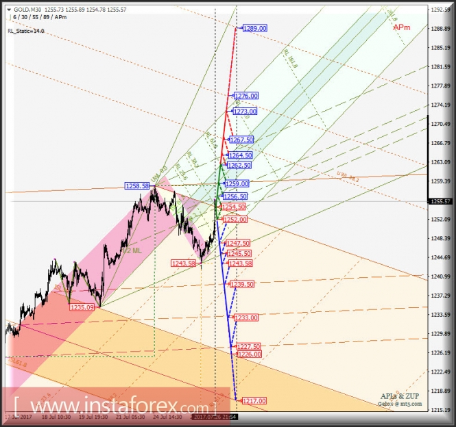 Развитие движения цены инструмента (Gold Spot) в период 27- 28 июля 2017 г. будет обусловлено отработкой границ канала 1/2 Median Line (1252.00 <-> 1254.00 <-> 1256.50) и зоны равновесия (1256.60 <-> 1259.00 <-> 1262.50) вил операционного масштаба Micro.