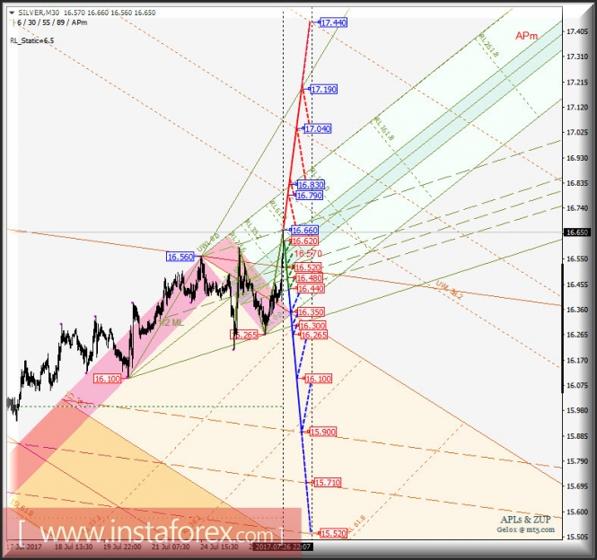 Развитие движения цены инструмента (Silver Spot) в период 27- 28 июля 2017 г. будет обусловлено отработкой уровня сопротивления 16.660 (конечная Shiff Line Micro) и уровня поддержки 16.620 (верхняя граница ISL61.8 зоны равновесия вил операционного масштаба Micro).