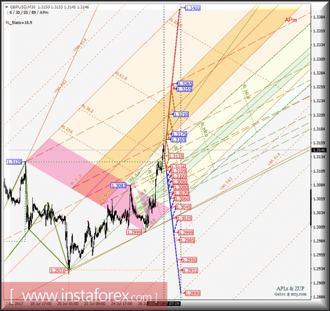Развитие движения цены инструмента (GBP/USD) в период 27- 28 июля 2017 г. будет обусловлено отработкой границ канала 1/2 Median Line (1.3109 <-> 1.3135 <-> 1.3165) вил операционного SubMinuette.